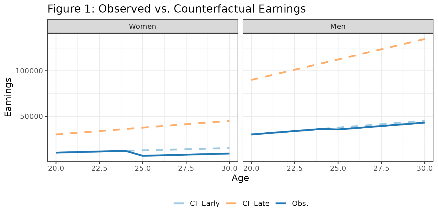 The aim of this vignette is to create intuition on the normalized triple differences (NTD) identification framework discussed in the paper. NTD is the underlying identification framework for normalized event studies, a common empirical strategy in the child penalty literature.