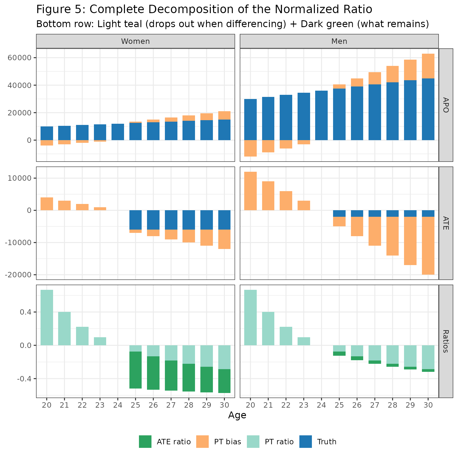 Takeaway: The bottom row (PT / DID APO) is identical for men and women at every age. Hence, under NTD, differencing across gender cancels out this bias parameter.