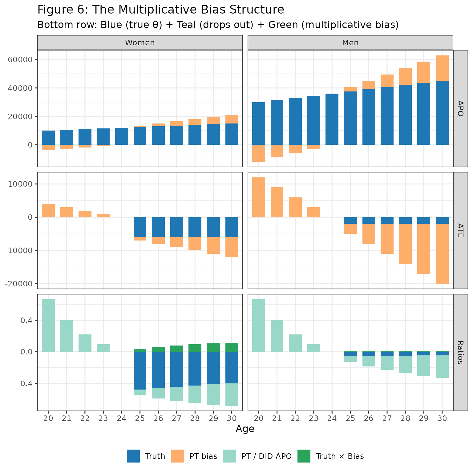 Here’s where it gets interesting. The (ATE / DID APO) (dark green in above figure) can be rewritten to reveal a multiplicative bias: