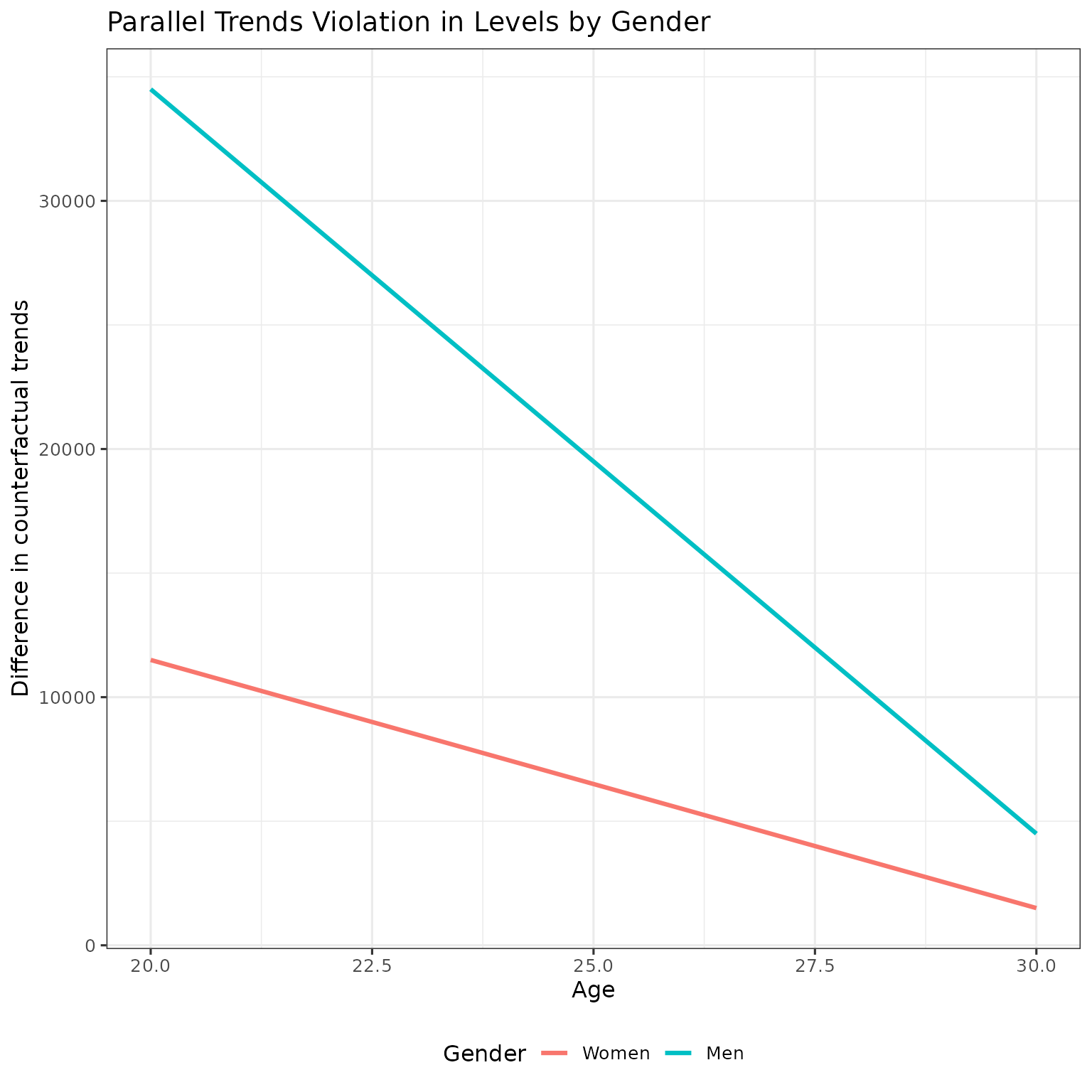 The parallel trends violations in levels are not equal across gender. Men’s violations are much larger because they have higher earnings. This violates both difference-in-differences (DID), whichassumes no violation, and triple differences (TD), which assumes equal violations in levels across genders.